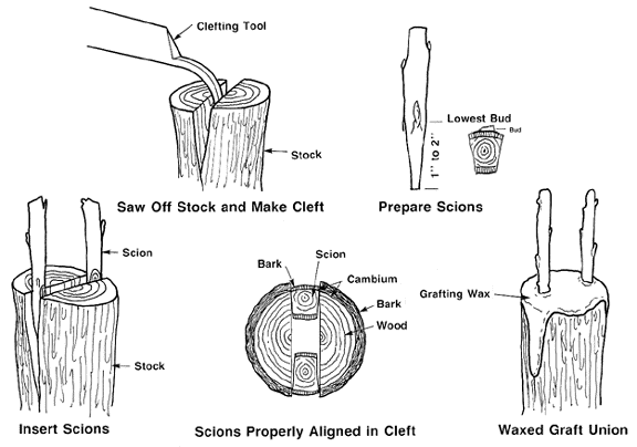 #1a. Cleft Grafting: 這是最常用的接枝法, 此法最合適的時間是冬眠後期. 一般來說, 適合此法的分支(Scions), 最好選擇一年老的新枝, 約三到四英寸長, 上面只有二到三個小苞.