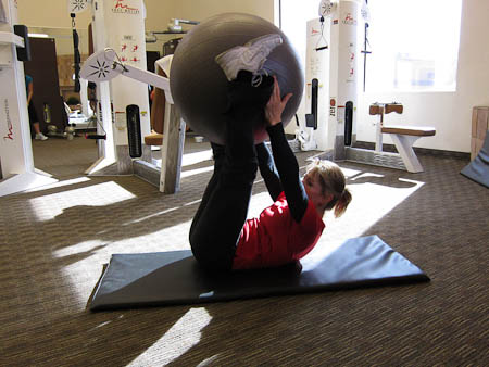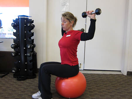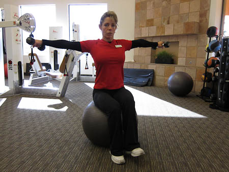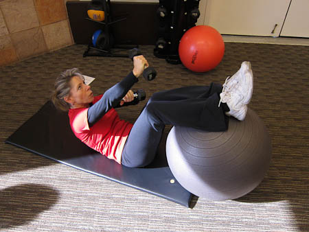1. 坐在球上 一隻腳離地 (更難的是將腳抬起伸直) 手拿啞鈴, 一次往胸前抬起, 一次往二側抬起.
