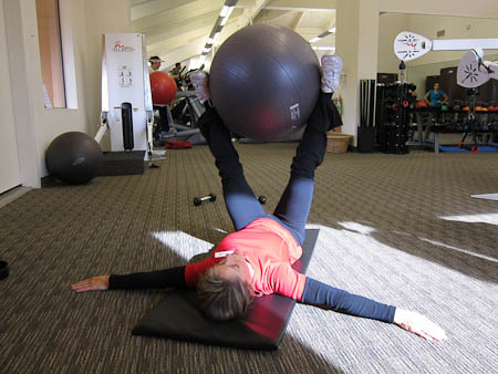 一邊作十次後, 換腳再做十次, 也是慢慢下, 慢慢上, 每腳做二組, 每組做十下 (一上一下算一次). 做完後放下球, 全身甩動一分鐘, 放鬆一下. 然後把球放在地上, 準備啞鈴, 做下一款動作.