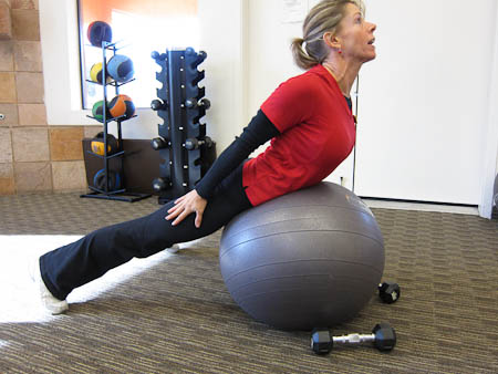 1. 吸氣 – 將球頂在腹部, 啞鈴放在二手可及的地上, 二腳打開伸直, 用腳掌頂住地板, 雙手往後伸直, 頭往上抬, 身體拉直.