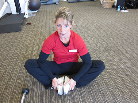 然後打坐, 小腿不重疊, 腳掌合併, 腳跟盡量往身體方向靠近.