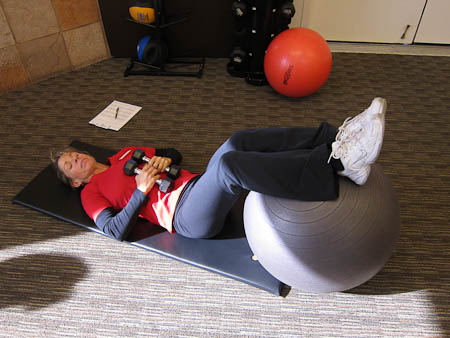 這個過程是慢慢下去, 慢慢上來, 要做二組, 每組做十下 (一上一下算一次). 做完後放下球, 全身甩動一分鐘, 放鬆一下. 下一款動作不需要啞鈴.
