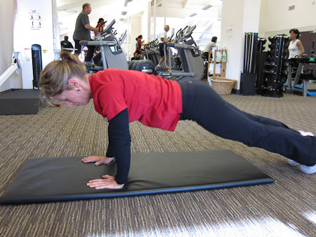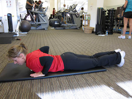 3. 然後身體打平, 但是腳和手都不能著地 (腹部肌肉要用力). 球從腳換到手算一次, 從手到腳也算一次, 各做五次. 腳要盡量打直, 很難, 如果腹肌不夠強壯的話.