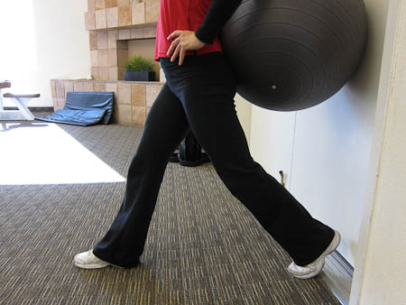 1. 吸氣 – 球頂在一樣的位置, 一隻腳不動, 另一隻腳往後放, 讓腳跟微微靠著牆.