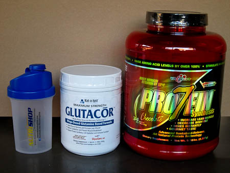 Jon 推薦我在增加肌肉的初期補充Protein Powder (紅瓶, 容量約一個月份), 可以每餐加一匙 (瓶內有附量匙), 也可以代替二餐之間的小點, 另外加一匙Recovery supplement來縮短肌肉痠痛的恢復時間 (白瓶, 容量約二個月份). 他送我一個外帶杯, 要我把各一匙的粉狀補充劑裝進外帶杯, 帶去健身房, 運動完後馬上加水, 搖一搖就可以喝了.