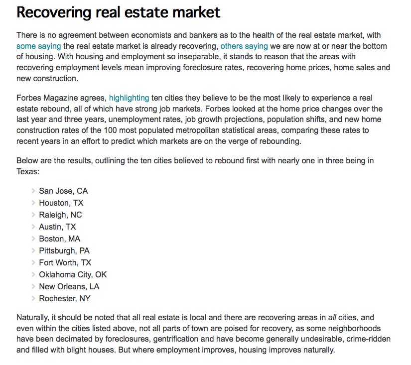房地產是非常區域性的, 但是一般媒體在寫地產市場方面的新聞時, 都是以美國整體而言, 或者以主要大都會區, 讀者很容易被聳動的字眼影響, 卻不是每個人都會冷靜思考分析. 紐約的地產行情和舊金山不一樣, 舊金山和洛杉磯的地產行情也不一樣, Milpitas和Sunnyvale也不一樣. 因為每個地區的行業別和年薪, 人口數和平均年齡, 種族和學區, 教育程度等等都不一樣, 所以非常難一括概全的評論.