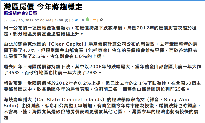 最近在中英文媒體上, 不斷看到有關舊金山灣區或是矽谷的房地產市場回暖的消息. 老實說, 等新聞上報, 距離實際發生都起碼已經晚了三到六個月了. 如果你真的等到報章雜誌介紹那支股票可以買的消息後才去買的話, 你肯定買的比行家要貴得多, 地產市場也是一樣的道理, 尤其當僧多粥少的時候.