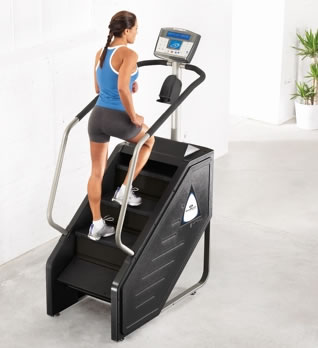 Step Mill (Stair Master) 爬樓梯機 – 我是用來暖身. 先照上圖那樣面向機器, 用腳跟著地的方式走一分半鐘; 然後側身, 整個身體面向機器左邊, 雙手扶著把手, 腳用腳叉方式走一分半鐘; 然後換邊, 面向機器右側, 腳用腳叉方式走一分半鐘; 然後背向機器, 倒著走一分半鐘. 這樣六分鐘暖身過後再去做健身機器.