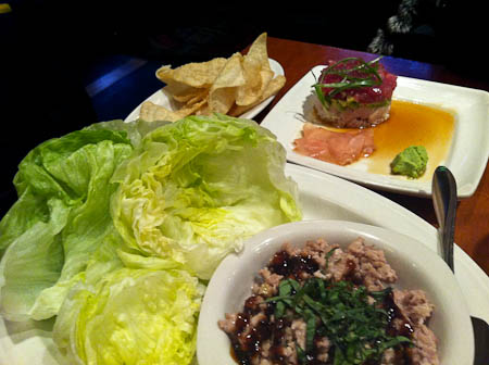 Los Gatos Brewing Company是老公愛去的啤酒吧, 我覺得他們的Happy Hour的小點選擇不是很多(因為我不愛吃炸的), 最好吃的就是上面這二種Ahi & Hamachi Tartare和Thai Chicken Lettuce Cups, 下面那個Meze Plate (Tsatziki, red pepper spread, hummus, falafel, tahini vinaigrette, flat bread) 尚可.