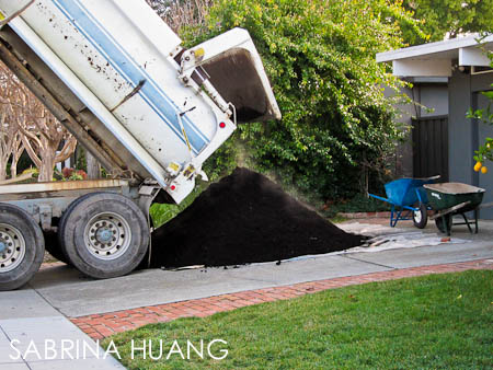 我家草皮是440sqft, 用了6 cubic yards compost, 最上面那層淺色的土, 是從右上角落那個raised boxe挖出來的, 將來那個地方要用作Compost Pile (4/7 from 9-12pm在Apple Farm有開課).