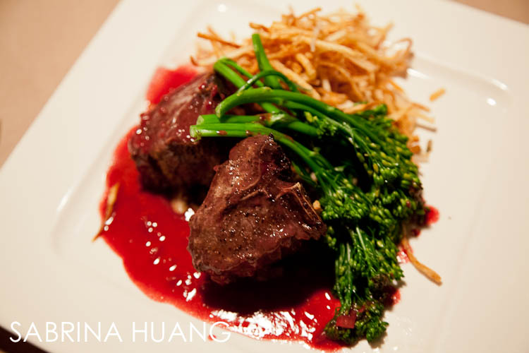 這道菜的主食原本是Pork Chop, 但是我想吃Lamb Chops, 但是我比較喜歡Pork Chop的Side Dishes (Lamb Chops的Side Dishes和昨天一樣 是馬鈴薯和蘆筍) 所以主廚就把Pork Chop改成Lamb Chops給我 但是其他不變Blackberry Marasala, Mushroom Ragout (太鹹), Broccolini and Petite Frites.