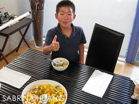 今天晚餐老公做芒果蝦仁義大利麵, 吃什麼水果都說喉嚨癢的老大, 終於舉起大拇指說好吃.