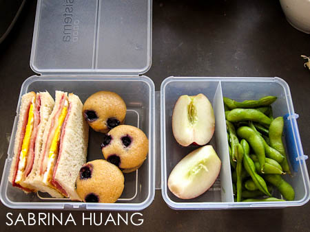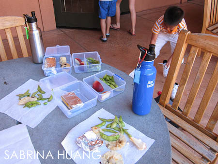 這下也七點了, 那就起床做便當吧 (早餐老公做, 同一個時間我做早午餐之間的便當小點). 幾天觀察下來, 我發現他們上完網球會餓, 等到他們玩水完上岸又餓, 所以給他們帶一個便當, 通常一個空檔吃一半, 這樣可以撐到回家吃午飯.