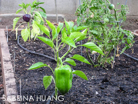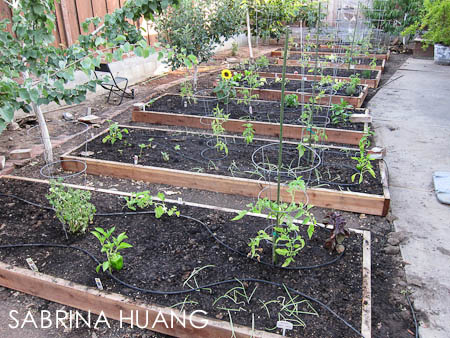 後來我送孩子去Full Circle Farm上農場營的時候, 在Farm Stand上遇到一位自己在家種蔬果的女士 (Gloria Nieto 408-280-6301/glorianieto[at]comcast[.]net), 情商之下, 後來換她來我家, 和我一起把之前買的/還活著的幼苗蔬果種下. 老公幫我把灑水系統改成滴水系統 (Soakers), 終於在獨立紀念日那天, 把菜園弄好. Gloria跟我說, 每二週就可以拍張照, 因為這些幼苗一旦種下去, 長得很快.