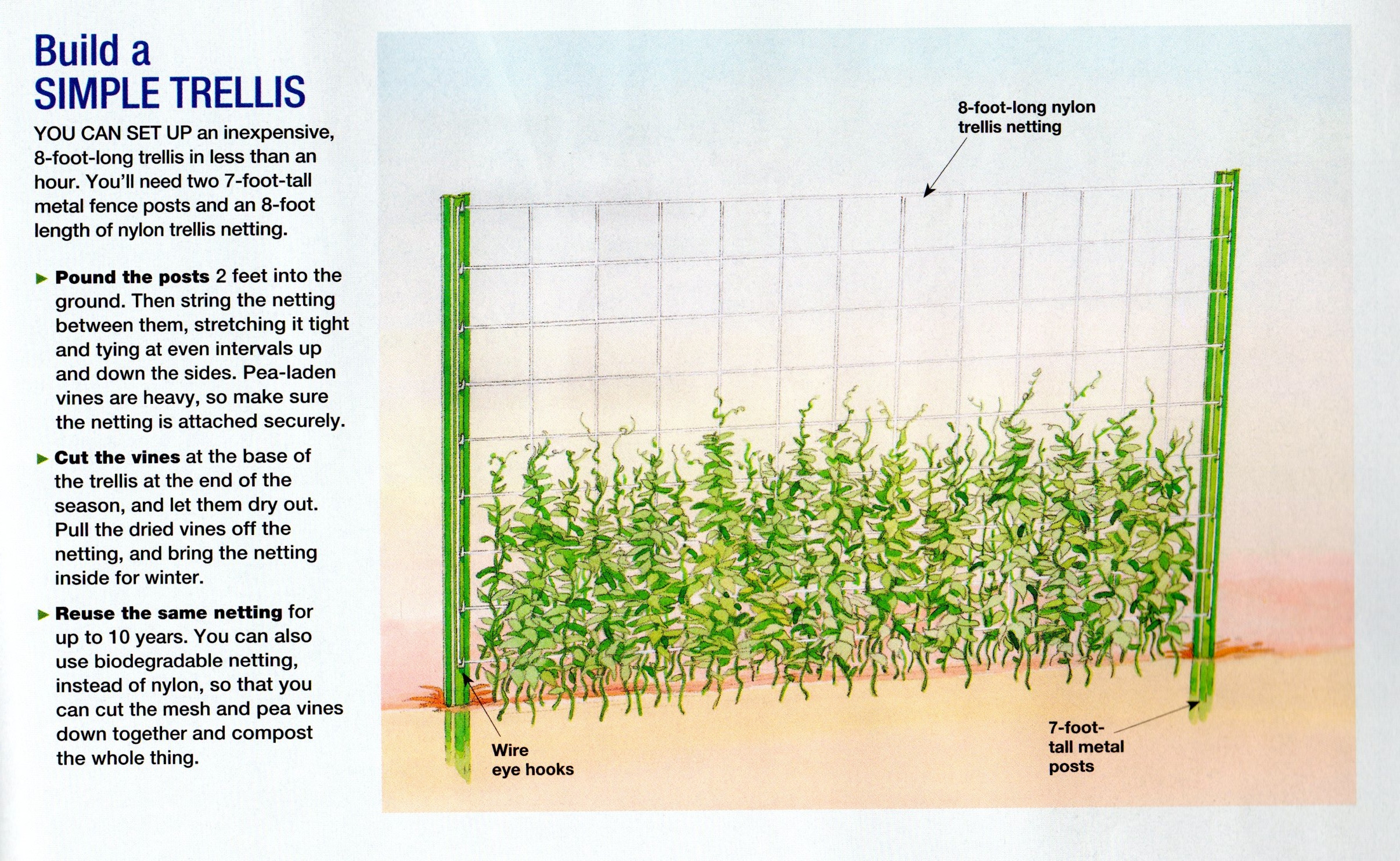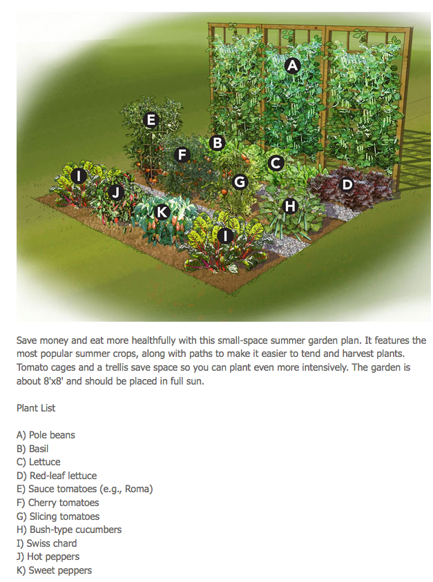 – 盡量利用 a tower, trellis, fence, vegetable cage or other sort of support 來種植 tomatoes, cucumbers and sugar snap peas, 這樣它們會往上長, 來節省空間.