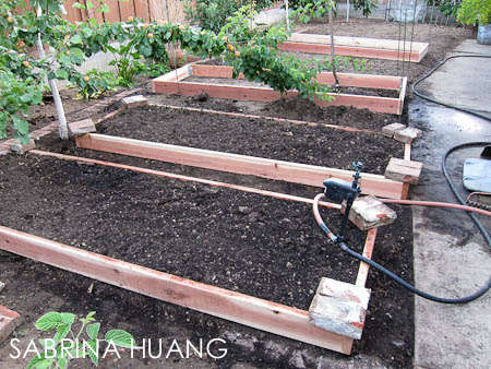 因為我現在是整個草皮蓋上紙板蓋上土, 等了二個月, 然後才要蓋框, 才要找灑水系統的各個灑水頭, 如果灑水頭的位置不是剛好在Rasied Bed裡面的話, 還得再挖洞, 把灑水頭的位置移到Rasied Bed裡面 (這是Troy的建議), 順序不太對, 所以麻煩多了. 後來我沒按Troy的建議 (因為不想挖洞), 灑水頭還是在原來的位置, 但是用別的方式將灑水改成滴水, 雖然外觀沒有Troy的那樣好看, 但是將來若要改回草皮, 原有的灑水頭位置沒變, 只要將滴水改回灑水就行.