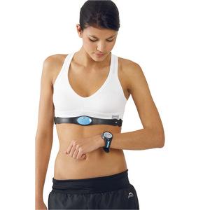 正確的戴法應該像上面右圖, Chest strap應該被壓在運動胸罩裡面, 從外面是看不見的, 這樣才能緊貼你的身體, 進而得到準確的心跳數. 左圖是故意露出來, 所以你知道Chest strap戴在哪裡. 不過在戴上之前, 記得先把Chest strap反面有二塊長條形的地方弄濕, 這樣會幫助偵測心跳. 我看網路Reviews, 有人戴著去游泳的.