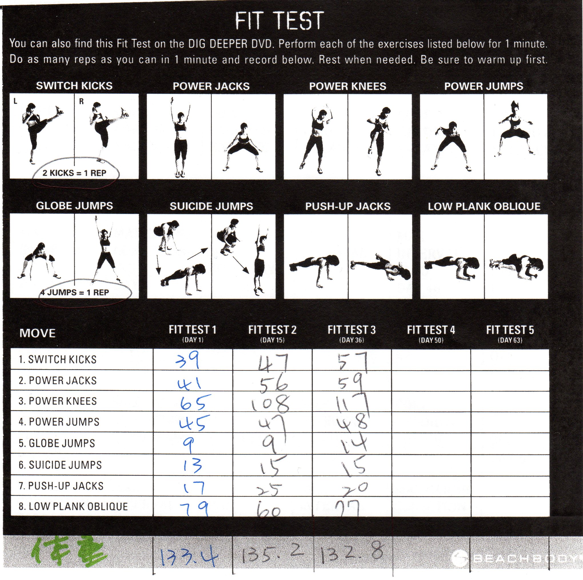 Day 1 是做Fit Test (分八項), 以一分鐘為限, 看每一項可以做幾下 (Day 1, 15, 36, 50, 63各測一次, 來看進步程度). 如果看圖不清楚, 把第一張DVD放出來看, 有示範. 不要以為看起來很簡單, 等你真的做了就發現, 他把Fit Test算一天是有原因的, 有點像是Reality Check, 讓原本自認體能不錯的人, 信心受到重擊 (例如我老公), 這樣第二天你就會比較認真, 甘願做四十分鐘的Cardio運動.