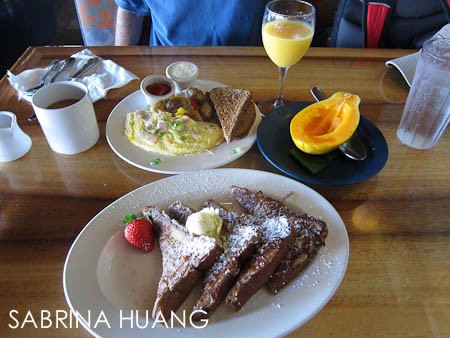 Onolicious French Toast (Molokai sweet bread, lilikoi lava butter), Fresh Orange Juice and Local Papaya.