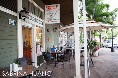 在我們要去Hana的當天早上, 路經Lahaina, 便去Espresso Italiano吃早餐. 這家咖啡店位在Lahaina Old Town Front Street的Side Street, 老闆娘是意大利人, 因為女兒在附近唸書, 三年前因為求方便就在這個位置開了這個小咖啡店, 有義式咖啡, 貝果三明治和法式三明治, 還有她自己做的義式杏仁蛋糕 (老公說很好吃).