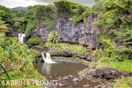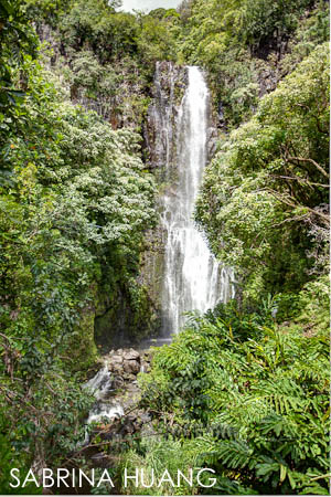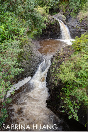 about 7 miles past Hana. There is a pull out area on the other side of the bridge past the falls. 這個瀑布是在橋邊, 開車經過就會看到, 過橋右邊有一個空地可以停車, 橋的另一頭有一個Trail可以走進去, 近看瀑布.