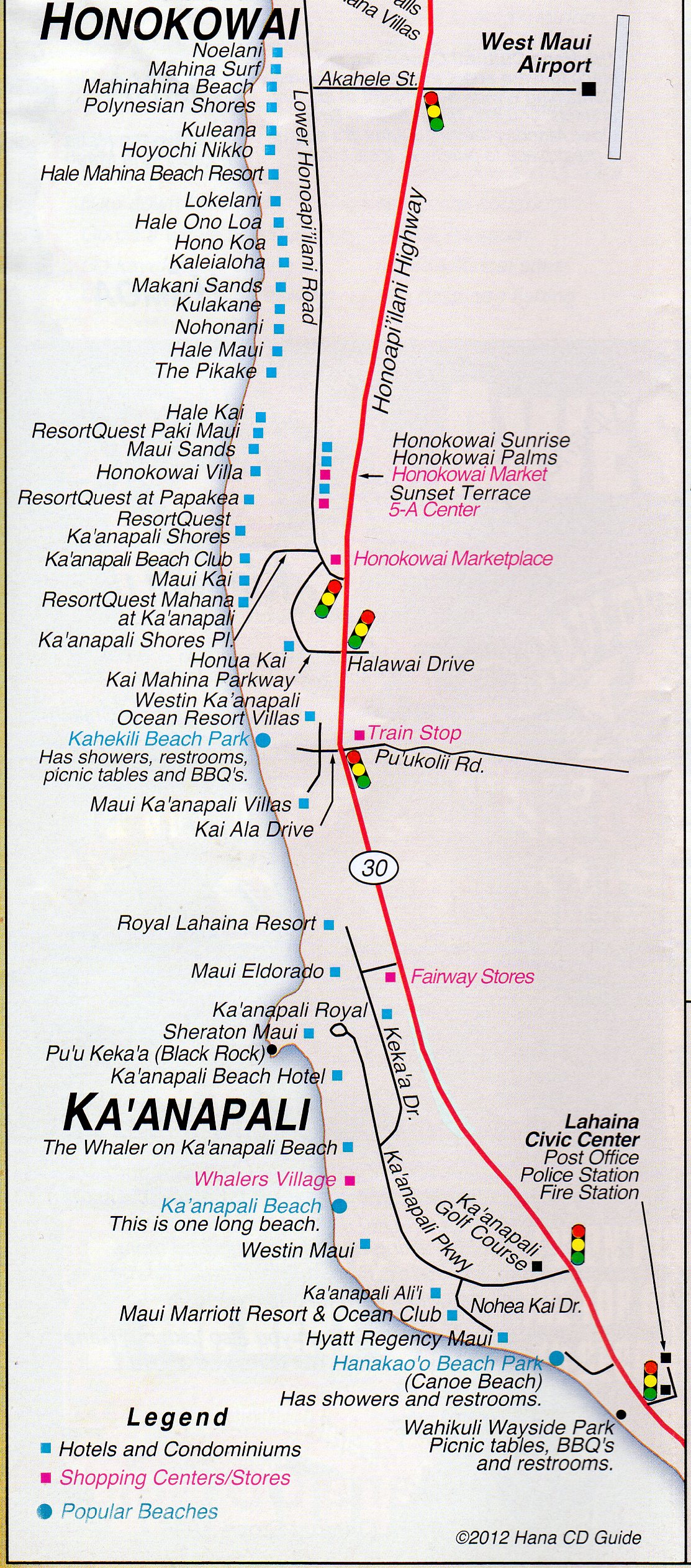 Maui West有一個Kaanapali Beach Walk, 從北邊的Duke's 到南邊的Hyatt Regency Maui約3 miles (45-60 min walk), 沿路上都是知名飯店, 每個飯店內有自己的購物商店和餐廳.