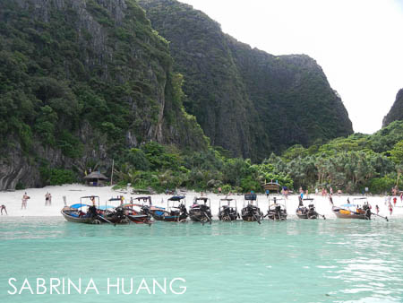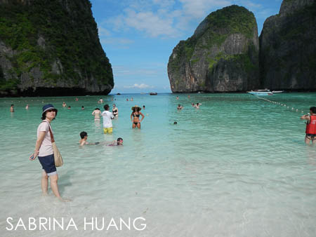 第一站先停Maya灣, 就是知名的電影The Beach (李奧納多主演)取景的地方, 停半小時, 到沙灘上走走, 拍拍照. 我們約九點半左右到, 不過人已經很多, 據說要是再晚點人更多.