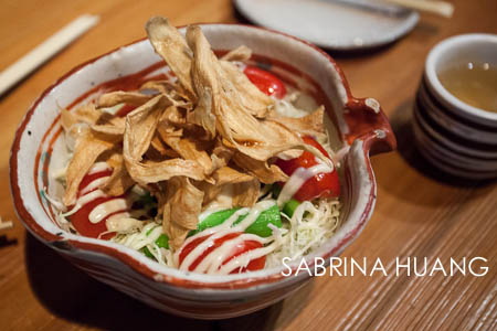 Hanabi和風沙拉 – 最上面是炸過的牛蒡, 然後是小番茄和蘆筍, 中間放有一個半熟的蛋, 要攪拌過後才享用.