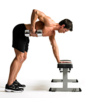 Single Arm Row – 雙腳打開, 重心放在腳掌和壓在椅子上的那隻手掌, 挺胸, 雙眼看斜前方, 身體不動, 那隻握啞鈴的手往上抬到啞鈴到腰部位置後, 往下伸直, 重復這個動作.