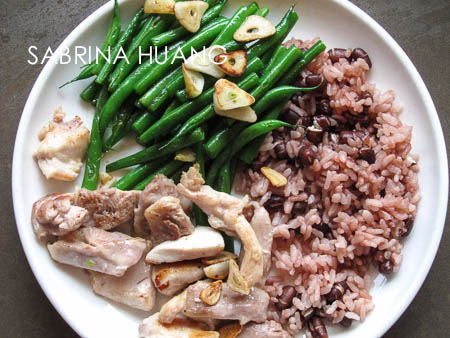 白花椰菜切小朵放在碗裡, 加點水微波二三分鐘後, 再放到已經有椰子油熱過的平底鍋上煎乾一點, 灑點松露鹽和胡椒, 就很好吃; 雞腿肉切小塊, 以椰子油熱鍋下去煎, 然後灑點松露鹽和胡椒; 半杯紅豆泡水一天後加一杯米煮成紅豆飯, 放在冰箱, 每頓中餐微波1/2 Cup, 外加一顆柳丁, 這樣就是一頓午餐, 方便快速又健康.