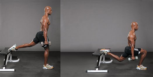 one-leg dumbbell squat with back leg elevated (spilt squats) – 膝蓋不要超過腳趾, 身體向前微傾, 縮小腹, 用腳跟的力量站起, 在板凳上的那隻腳只提供平衡作用 (不用力). 這一個是做臀部曲線.