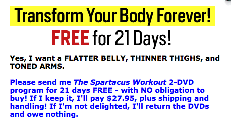 The Spartacus Workout 2-DVD (The Total-Body Blitz & The Triple-Set Scorcher)$27.95+Shipping, 有21天免費試用期, 二十年內不滿意都可以全額退費, 不過你上網訂購的時候, 會看到有額外的三片DVDs – Abs, Fat Torchers, Body-Weight Revolution, 各$17.95, 這樣加一加, 等於五片DVDs要$81.80. 如果你有意一試, 記得選擇Bill Me Later, 而不要給信用卡資料, 這樣你就沒有風險, 不用怕將來不喜歡, 要退費的問題, 直接寄回去就可以了.