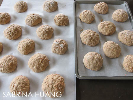 – To form the buns, divide the ball into 8 (我是切六份) roughly equal portions (each about the size of a golf ball). Shape each one into a smooth ball. Allow them to rest, loosely covered with plastic wrap, on a cookie shhet lined with parchment paper for 40 min.