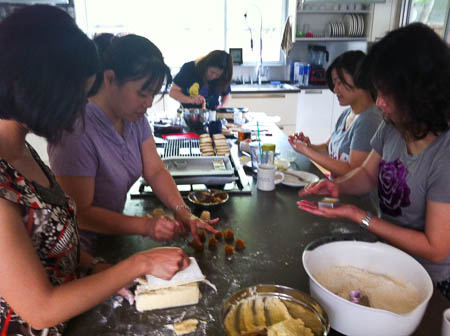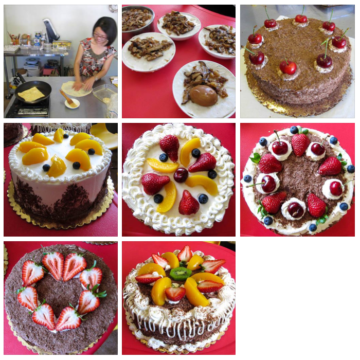 芋泥布丁蛋糕裝飾課(午餐涼麵) – 老師事先把蛋糕體和芋泥做好放涼, 布丁是買現成的, 然後我們負責組裝和裝飾. 用奶油作裝飾可不簡單啊, 六個同學六個造型, 老師傾囊相受. 我的蛋糕是上圖右下角那個有奇異果繞一圈的.