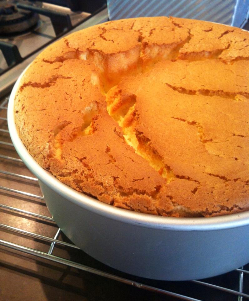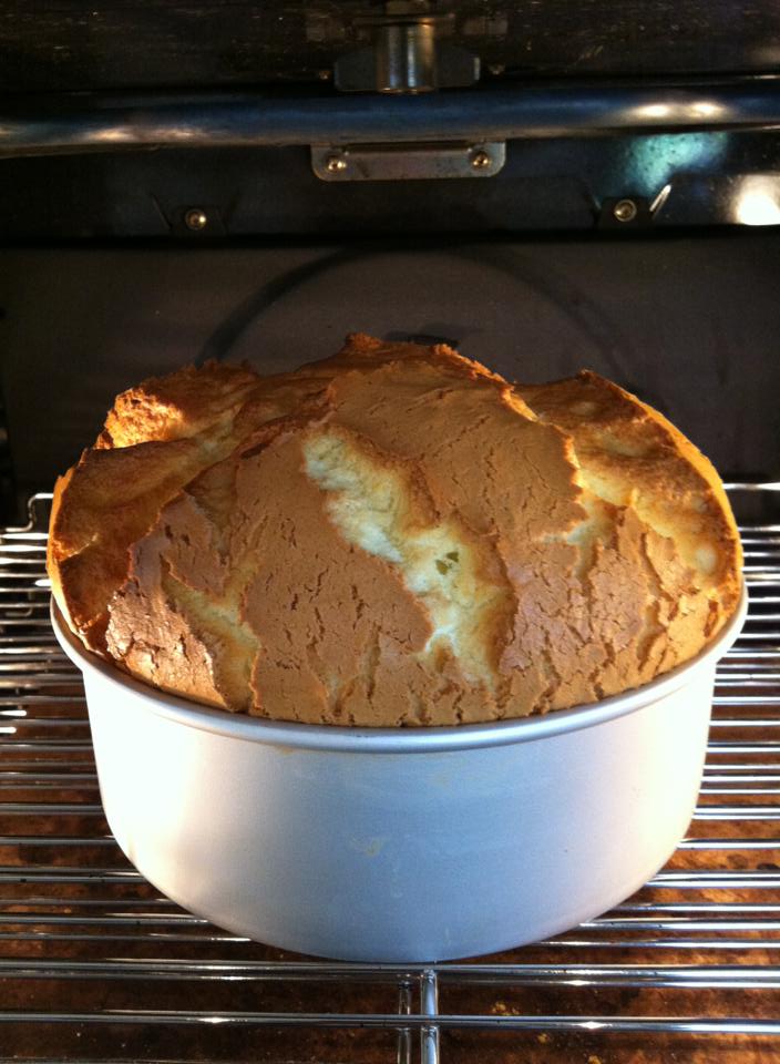 隔天我去Sur la Table買一個8×3 Fat Daddio’s Round Cake Pans (aluminum), 回家試第二次. 剛出爐的時候發的比模子再高一點, 沒幾秒就縮回去. 上圖是倒扣之前的樣子.