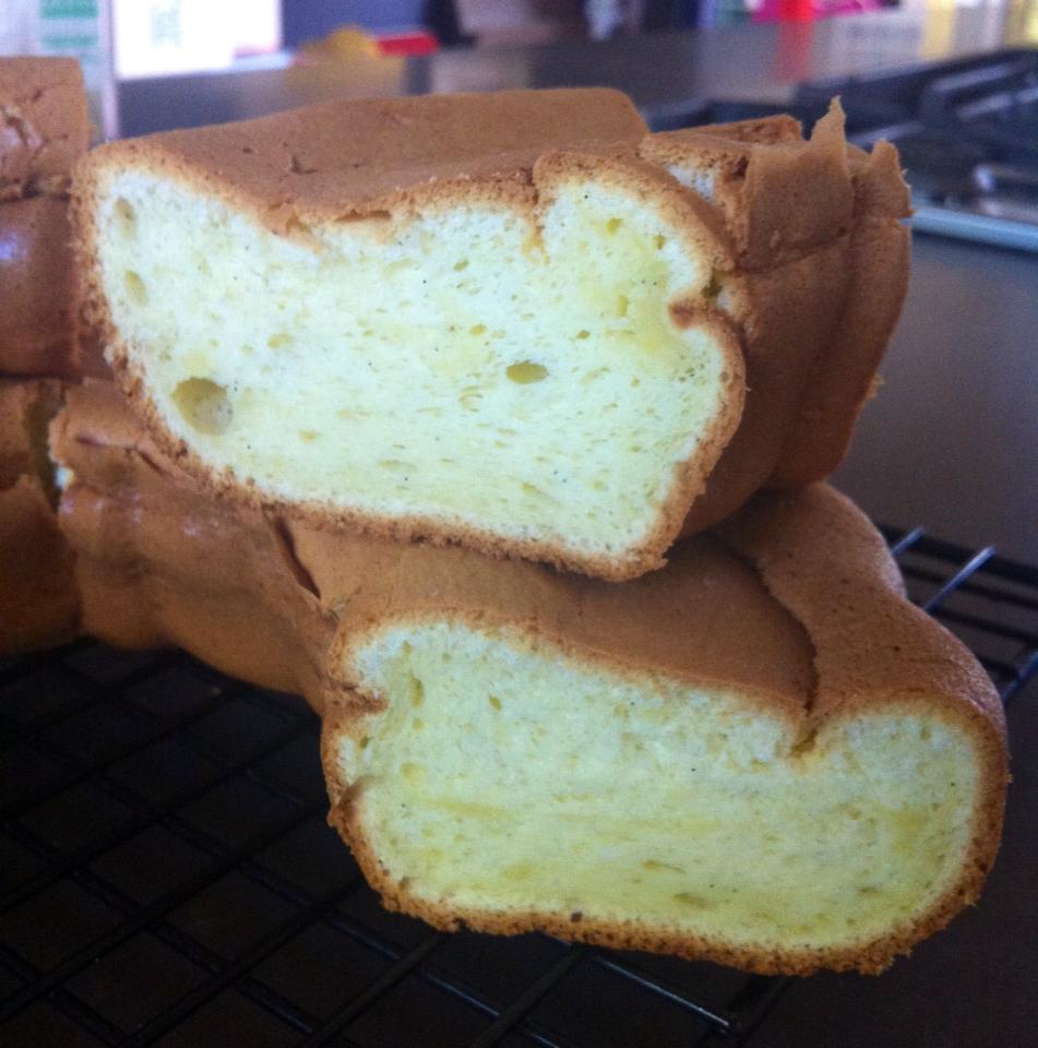 第一次照著食譜做的結果, 外表不太美, 似乎膨脹的不夠 (原因出在我用不粘模), 口感有點像銅鑼燒, 沒有戚風蛋糕應有的蓬鬆, 不過還是蠻好吃的, 因為我本身不太吃甜點, 但是這個算失敗的蛋糕讓我不小心就吃掉了四分之一.