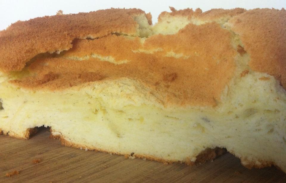 然後隔天一早又試做第四次(完全按原作的食譜), 不過這次做了幾個調整 (1)用新買的Giusto's Unbleached High Ratio Cake Flour (之前三次都是用新買的King Arthur Unbleached Cake Flour Blend), (2)將蛋糕放在烤箱中間烤 (因朋友覺得我之前幾次蛋糕位置可能放得太下面), (3)以320F烤二十分, 350F烤二十五分. 結果倒扣冷卻沒多久, 蛋糕自己就掉下來, 看起來底部回縮的厲害, 是還不錯吃啦, 但是樣子還是很奇怪啊.