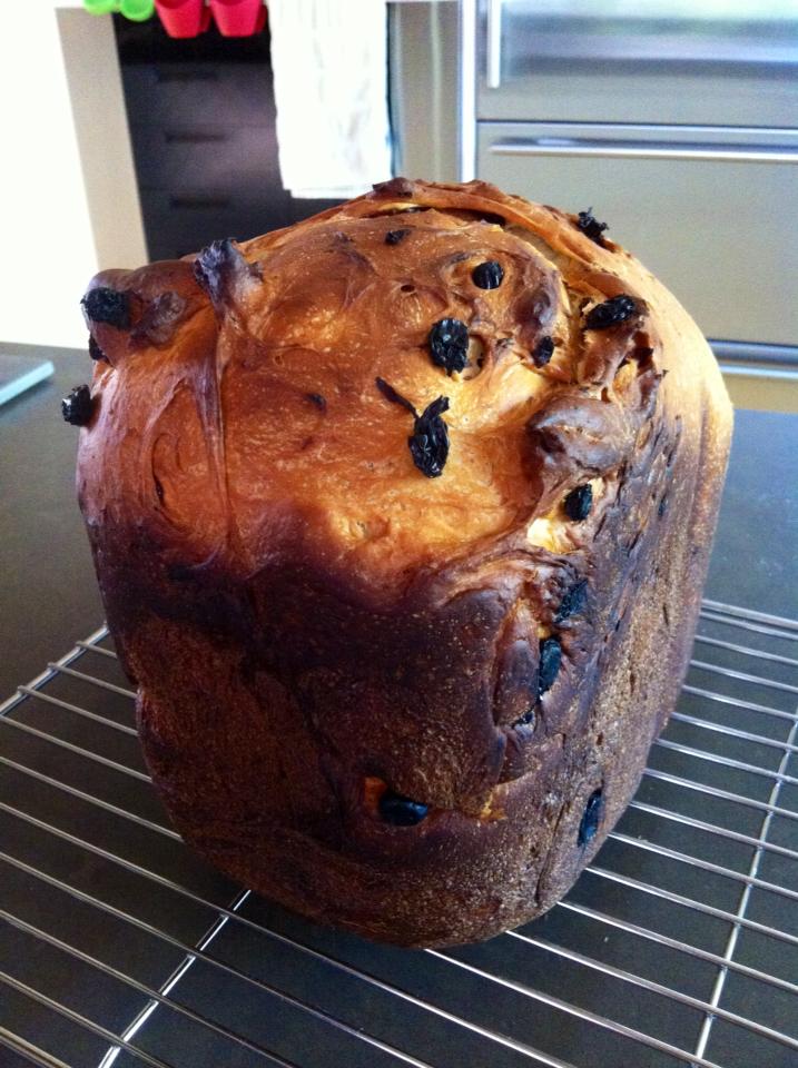 我用上面那個湯種白土司的食譜做葡萄乾土司, 差別就在於設定選擇Bake Raisin, 第一次揉麵完成後 (Start後42分鐘左右) 會有嗶嗶聲, Bake Raisin會閃動, 這時就要手動加入葡萄乾, 三分鐘後會繼續攪拌, 你不用管它, 一直到最後烤好出爐. 不過因為使用Bake Raisin設定 就無法更動Crust及Size, 所以烤出來的皮偏乾厚, 新鮮出爐的還不錯吃, 但是我想隔天可能就得把皮切掉了.