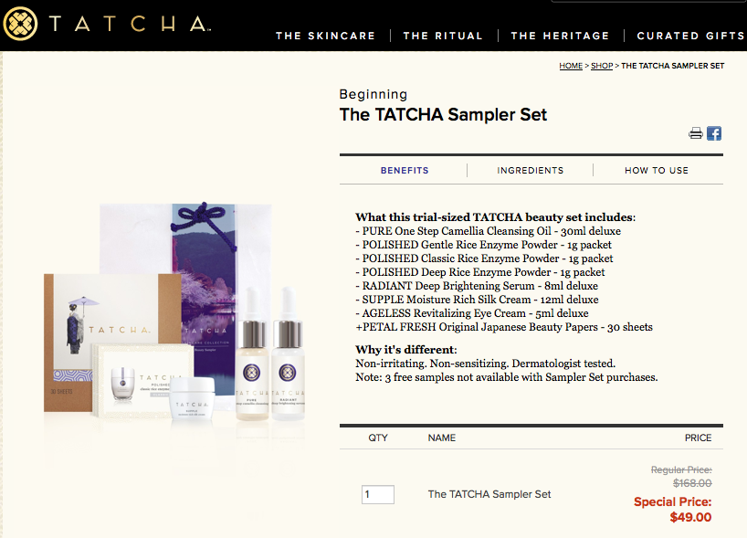 剛好Tatcha有出一套試用品 (Sampler Set), 內容涵蓋六款主打項目 (不含護唇, 保濕噴霧, 面膜), 不但分量足以用二週, 非常大方, 而且價格實惠, 下單後二天內就會收到, 超有效率. (記得上網搜尋coupon code, 有時候會有其它贈品加送喔)