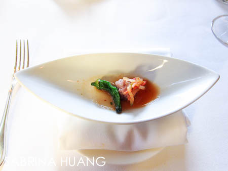 期待很久的那天晚上終於到來, 難得打扮的我還特地穿得漂亮些, 和老公準時六點就到餐廳, 一進門, 一男一女很熱情地打開大門迎接, 帶位小姐領我們到第一間房, 靠窗的位子坐下, 然後就收走我的TravelZoo優惠卷, 服務生接著上菜單和酒單, 這時我就提起我們是使用TravelZoo優惠卷的八道主廚套餐 (有些餐廳會有另外一個菜單是給使用優惠卷的食客), 服務生要求看我的TravelZoo優惠卷, 我說領抬小姐拿走了 服務生去找領台小姐看完我們的TravelZoo優惠卷回來後, 很客氣地告知我們, 通常優惠卷是不能在週末使用, 不過既然我們已經來了, 就安心享用吧.