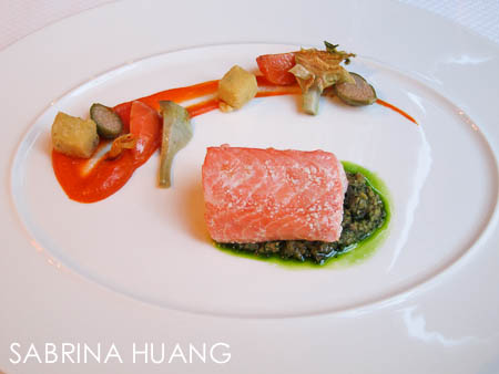 Extra Virgin Olive Oil Poached Salmon with Sweet carrots, Artichokes, Caper Berries, Picholine olive and chickpea "Tots" and preserved Meyer lemon gremolata.