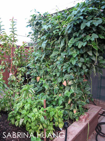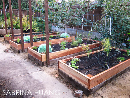 (後院) 先清出四個菜箱, 加高後, 九月底種下三種甜碗豆 (鐵網還沒釘上), 三種冷季番茄, Fennel, 和香料區.