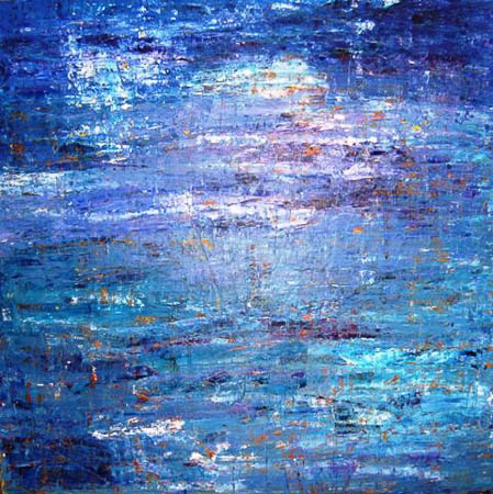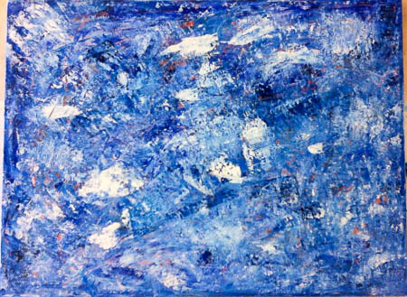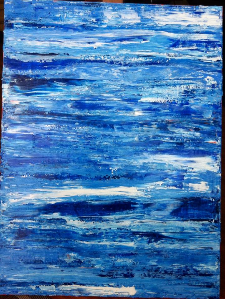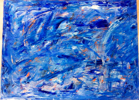 等乾, 再上一層不同的藍色加白色, 把之前的橘色蓋掉. 這時候我剛好問Lori, 你怎麼知道畫好了? 她看看我這個時候的畫, 然後說: 我想差不多了. 我也覺得差不多了, 因為已經有四層的漆, 而且Texture有出來, 我還蠻喜歡的, 適時停手吧. (第一幅畫)