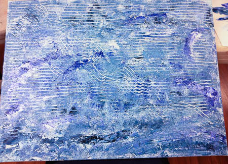 Second Layer – 拿了扁梳刮些線條痕跡, 當晚就畫到這裡, 讓它乾透, 下次再完成.