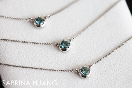 我在Yelp上找到Wenric’s Jewelry Services (Wendy & Rick), 先用email聯絡, 我把想要的項鍊款式的圖檔寄給Rick, 詢問”大約”的製作價格 (有純銀, K金, 白K金, 白金可選), 然後才帶我的石頭去他們家. 見面那天, Wendy先從石頭裡挑出三顆尺寸相近, 顏色和切割品質較好的出來, 然後和我討論石頭鑲的方式, 挑選鏈子的款式和長度, 用手畫個草圖, 寫估價單, 然後我就可以回家等待. (他們兩人約五十幾六十歲吧, 家裡有養大狗)
