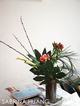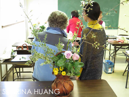 我覺得這位老師對我同時學二種風格不太認同, 第一次上課之前的email往來時我據實回答, 她雖然沒直接說什麼, 但是開始上課的時候總覺得她對我的態度有點冷, 在我自我介紹的時候, 她有說希望我不要把二種流派混淆, 但是Sogetsu不也是從Ikenobo發展出來的嗎? 而且我的目的並不是要拿Ikenaba的教師證書, 只是想多方面學習, 最後找出我自己中西混合的插花風格罷了.
