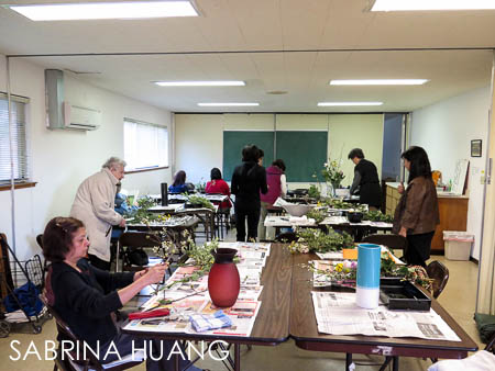 我第一次上課那天約有12位學生 (五位台灣人, 四位日本人, 三位美國人), 每位學生輪流當助手 (準備報紙, 垃圾袋, 從老師車上拿花材到教室, 課後清潔), 另外有學生專門負責收費, 發email提醒上課, 算是很有制度的班級. 第一次上課請帶Ikebana專用剪刀, 淺的花器和一個圓徑約八寸的碗(裝水剪花用).