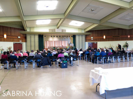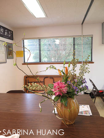 Sogetsu Ikebana老師是Kika Shibata, 她也是十幾歲就來美國的日本人 (英文說的不錯, 但還是聽得出來口音), 一個月上二次課 (我參加的這班在Campbell的日本寺院上課 | 註一), 一個月$37 (含花材; 9-12位學生), 課本$25 (英日文, 彩色圖片和繪圖圖解).