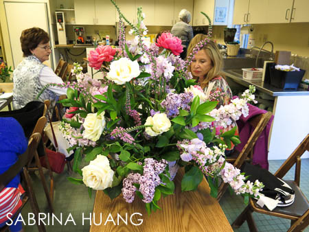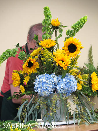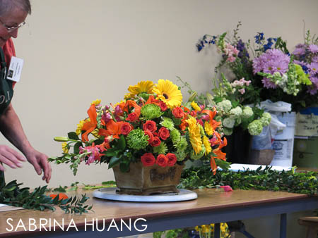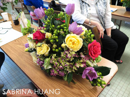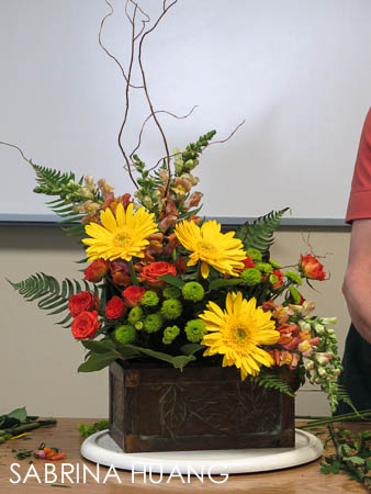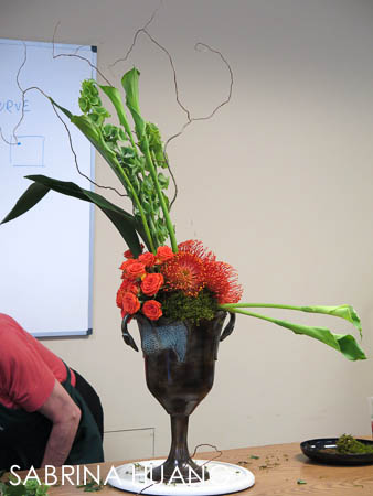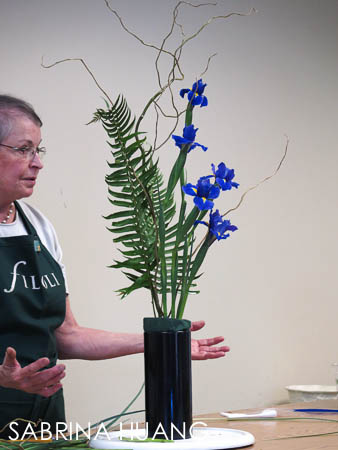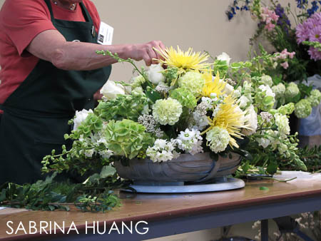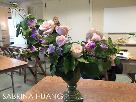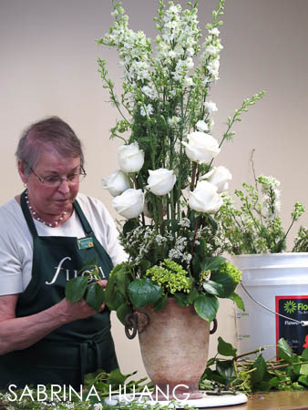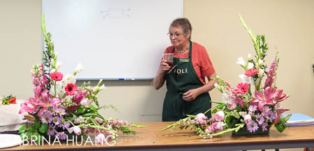 老師示範Facing Arrangements. 我覺得Facing Arrangement和我之前在California Flower Art Academy學的基礎歐式插花裡的圓錐型(Cone Style)有點類似, 也有點像三角型 (Triangle Arrangement), 所以我不是很確定到底怎麼插.