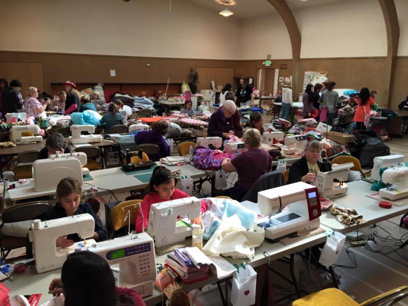 今天早上9點我帶著我的縫紉機去到San Jose市區的一個教堂, 看到好多人已經開始忙了. 99%是女性, 年紀從十歲到七十歲都有 (18歲以下需要有成人陪伴), 大家分配工作, 會車的人就負責縫紉機, 不會縫紉的人可以幫忙Cut fabric, Pin fabric, Stuff cube, tie blanket, iron, etc., 反正你一定有可以幫到忙的地方.